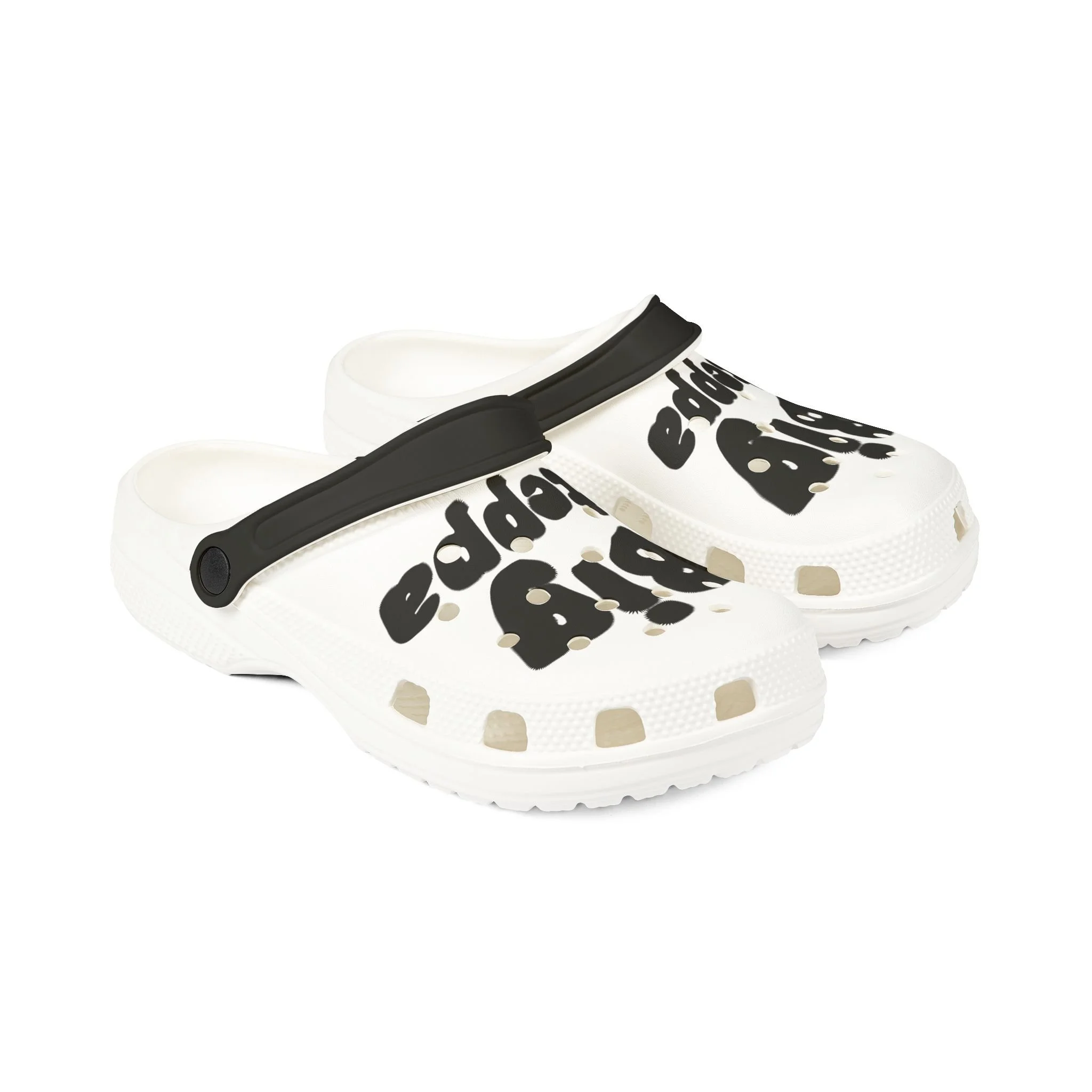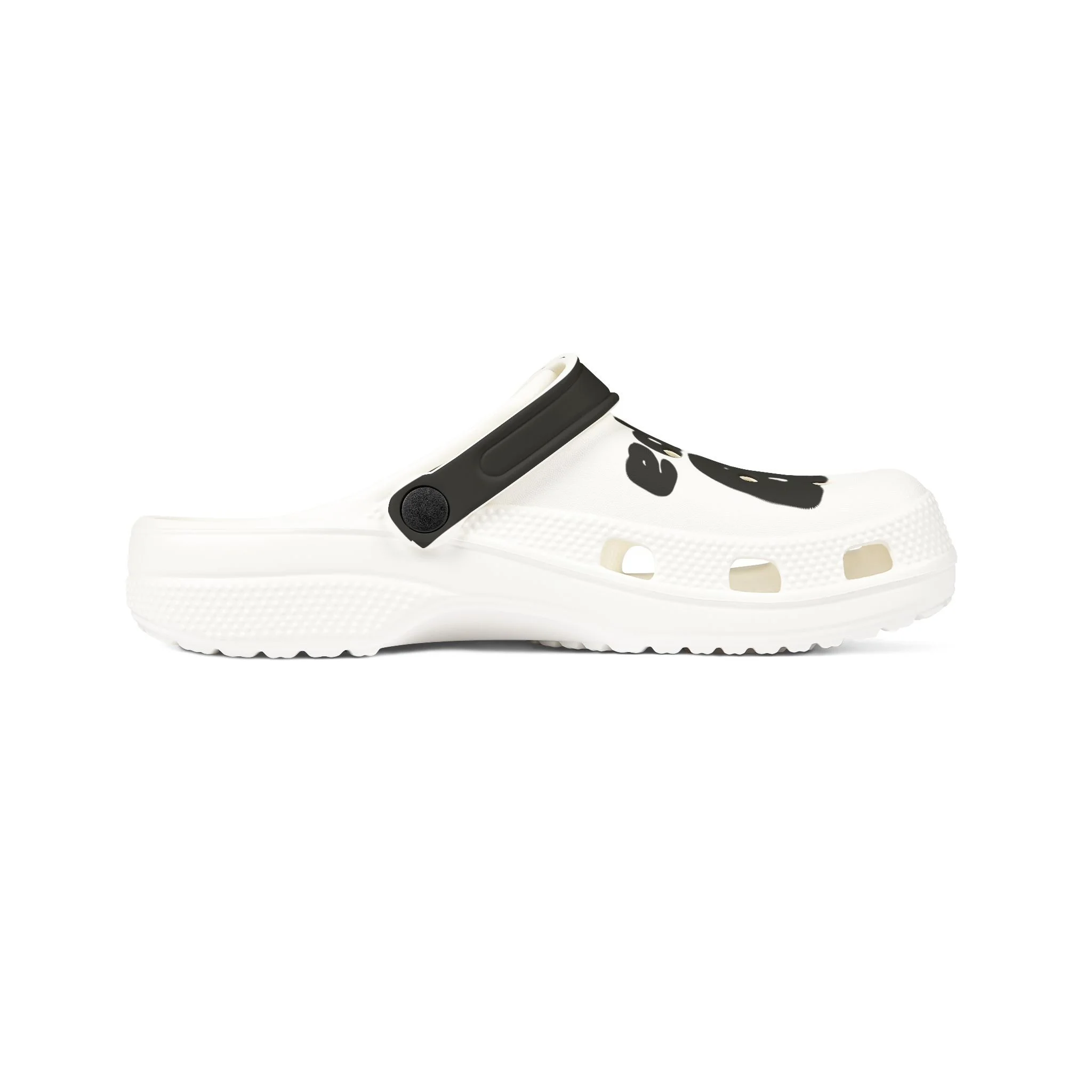 Product features - 100% EVA construction — light, flexible and water-resistant - Soft EVA sole with anti-slip tread for stable steps - Adjustable strap for slip-on or secure heel fit - Black-and-white printed upper and strap with vent holes for breathability - Includes assorted clog accessory charms; EU size embossed on sole